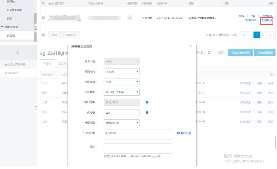 登錄阿里云控制臺,在云服務(wù)安全組新增規(guī)則,克隆一個規(guī)則出來并把端口號修改成mysql的3306,再次遠(yuǎn)程連接還是失敗。