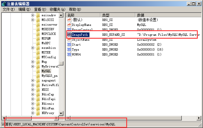 HKEY_LOCAL_MACHINE\SYSTEM\CurrentControlSet\services\MySQL