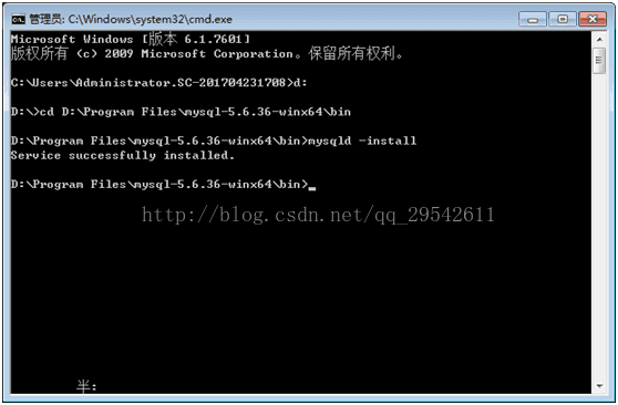 5、安裝mysql服務(wù) ,dos窗口切換到MySQL的bin 目錄下 執(zhí)行命令