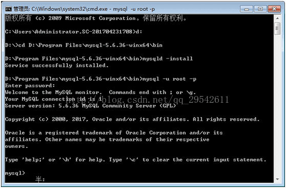 由于默認(rèn)的用戶名為root 密碼為空 使用命令mysql –u root –p按回車提示輸入密碼直接回車就可以登錄啦。到此mysql-5.6.36-winx64綠色版就安裝成功。