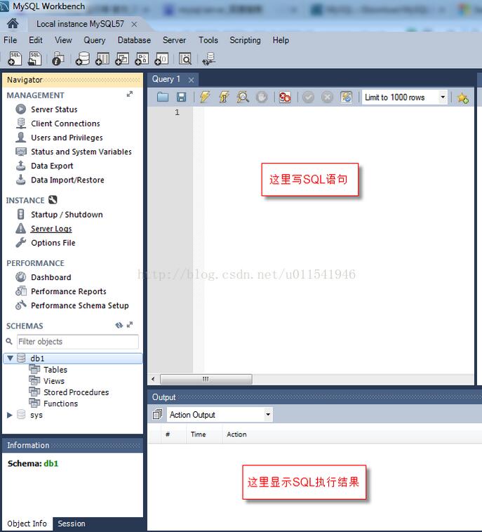 上圖中db1是我們新建的數(shù)據(jù)庫,sys是MySQL Server安裝完后,默認(rèn)的一個數(shù)據(jù)庫。以后我們都用MySQL Workbench來連接我們數(shù)據(jù)庫,然后手動或者SQL語句去創(chuàng)建表等相關(guān)數(shù)據(jù),整體界面如下。