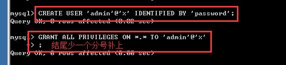 注意:admin'@'%中的百分號,這里使用百分號意味著允許任意遠程客戶端連接。root@localhost意味著只允許本地客戶端連接。