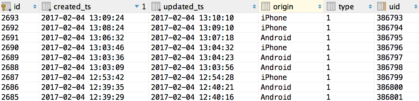 其中 origin 是用戶來源,其中的值有 iPhone 、Android 、Web 三種,現(xiàn)在需要分別統(tǒng)計由這三種渠道注冊的用戶數(shù)量。