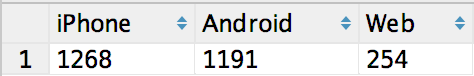 SELECT sum(if(origin = 'iPhone', 1, 0)) AS iPhone, sum(if(origin = 'Android', 1, 0)) AS Android, sum(if(origin = 'Web', 1, 0)) AS Web FROM user_operation_log;