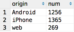 SELECT count(origin = 'iPhone' OR NULL) AS iPhone, count(origin = 'Android' OR NULL) AS Android, count(origin = 'Web' OR NULL) AS Web FROM user_operation_log;