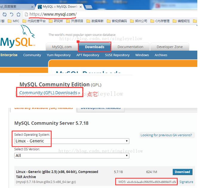 1、下載MySQL:官網(wǎng)https://www.mysql.com/,點(diǎn)擊Downlosas,翻到網(wǎng)頁底部,下載社區(qū)版,一路點(diǎn)下去,選擇通用Linux,下載64位那個(gè),注意檢查MD5