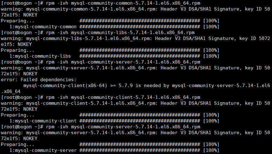 rpm -ivh mysql-community-common-5.7.14-1.el6.x86_64.rpm rpm -ivh mysql-community-libs-5.7.14-1.el6.x86_64.rpm rpm -ivh mysql-community-client-5.7.14-1.el6.x86_64.rpm rpm -ivh mysql-community-server-5.7.14-1.el6.x86_64.rpm