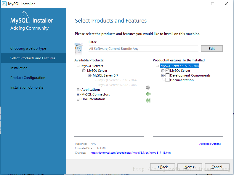 4、選中之后箭頭變成綠色,點擊綠色箭頭將當(dāng)前product移動到需要安裝的列表。然后在右邊展開MySQL Server 5.7.18x64項,取消Development Components”MySQL圖標(biāo)前會出現(xiàn)一個綠色的勾,然后點擊“Next”進(jìn)入配置界面。
