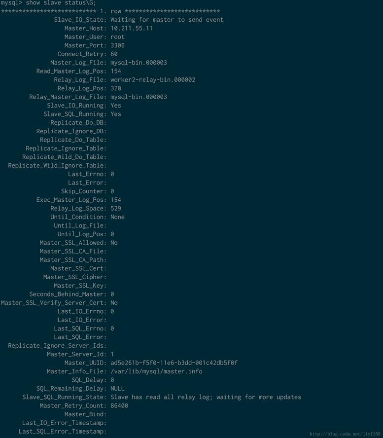 3. 查看salve狀態(tài),show slave status\G; 注意這里的”\G”是為了顯示格式化的結(jié)果,如果沒有錯誤的話,slave的狀態(tài)結(jié)果如圖所示: