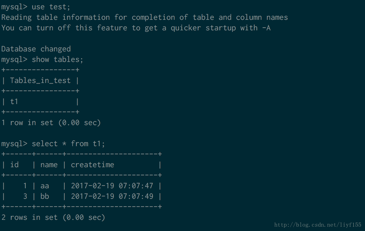 mysql> create database test; mysql> create table t1 (id int,name varchar(200),createtime timestamp,key(id)); mysql> insert into t1 values (1,'aa',now()); mysql> insert into t1 values (3,'bb',now());