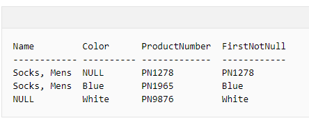 SELECT Name, Color, ProductNumber, COALESCE(Color, ProductNumber) AS FirstNotNull FROM Products ;