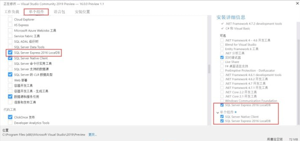 如果選了.NET負(fù)載,直接在里面勾上就行;如果沒有,選到單個(gè)組件,勾上localdb,會自動勾上下一項(xiàng)那個(gè)依賴。