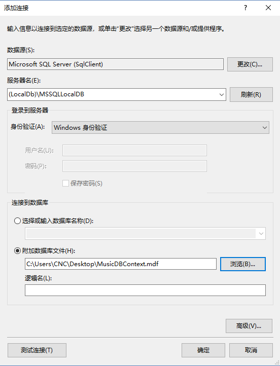 然后附加一個(gè)名稱為MusicDBContext.mdf的數(shù)據(jù)庫文件(文件可以自己定義)并點(diǎn)擊確定,此時(shí),MusicDBContext.數(shù)據(jù)庫作為默認(rèn)的數(shù)據(jù)庫,我們可以選擇SQLLocalDB中的其他已有數(shù)據(jù)庫。