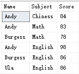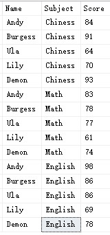有一張學(xué)生表,分別name,學(xué)科,分數(shù) 這三個字段,如下:
