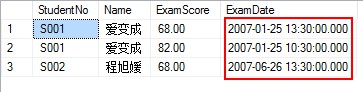 SELECT T1.StudentNo, T1.Name, T2.ExamScore, T2.ExamDate FROM Student AS T1