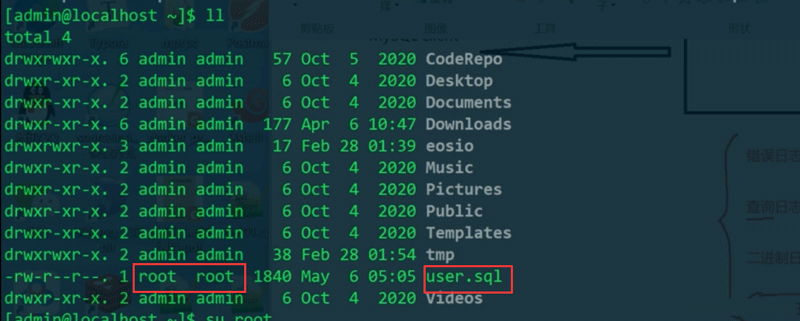 現(xiàn)在user.sql是root的文件,我們變更一下屬主,使得普通用戶(hù)也可以操作