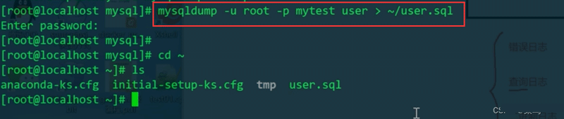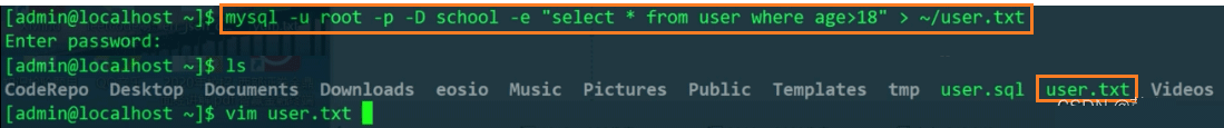 mysql -u 用戶(hù)名 -p -D school -e 'select * from user where age>10' > ~/user.txt