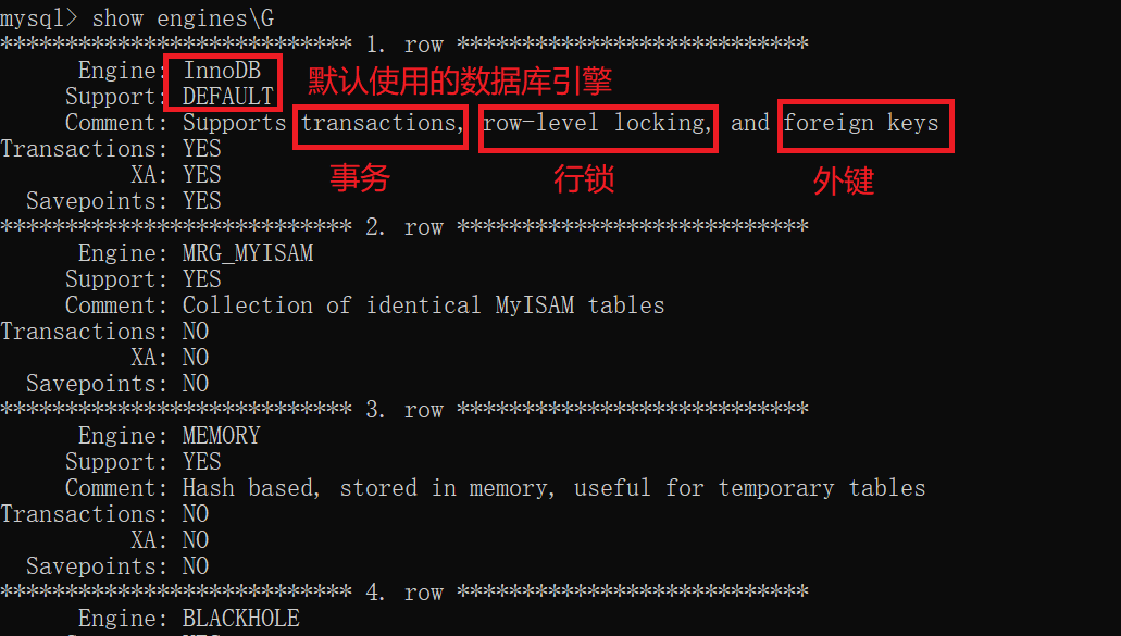 用show engines\G查看當(dāng)前數(shù)據(jù)庫支持哪些存儲(chǔ)引擎。