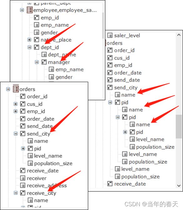 - 第二個(gè)句子中粗體部分表示當(dāng)前員工的“所屬部門的經(jīng)理的國(guó)籍”。我們把外鍵字段理解成維表的記錄后,維表的字段被理解為外鍵的屬性,department.manager即是“所屬部門的經(jīng)理”,而這個(gè)字段在department中仍然是個(gè)外鍵,那么它對(duì)應(yīng)的維表記錄字段可以繼續(xù)理解為它的屬性,也就會(huì)有department.manager.nationality,即“所屬部門的經(jīng)理的國(guó)籍”。