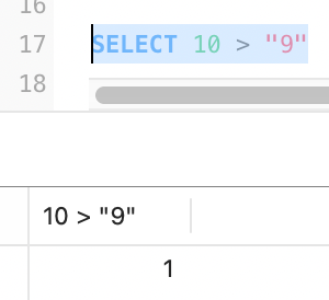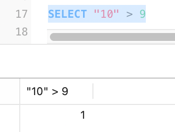 如果是字符串轉(zhuǎn)數(shù)字,那么就相當(dāng)于select 10>9,結(jié)果是1