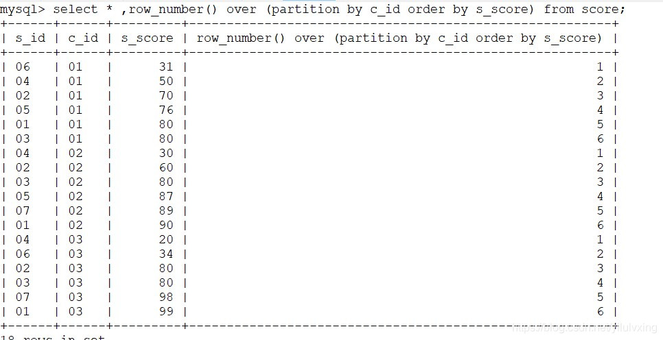 select * ,row_number() over (partition by c_id order by s_score) from score;