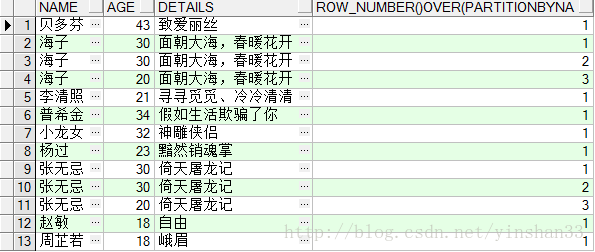SELECT?name,age,detail,ROW_NUMBER()?OVER(PARTITION?BY?name?ORDER?BY?age?DESC)?FROM?TEST_Y;