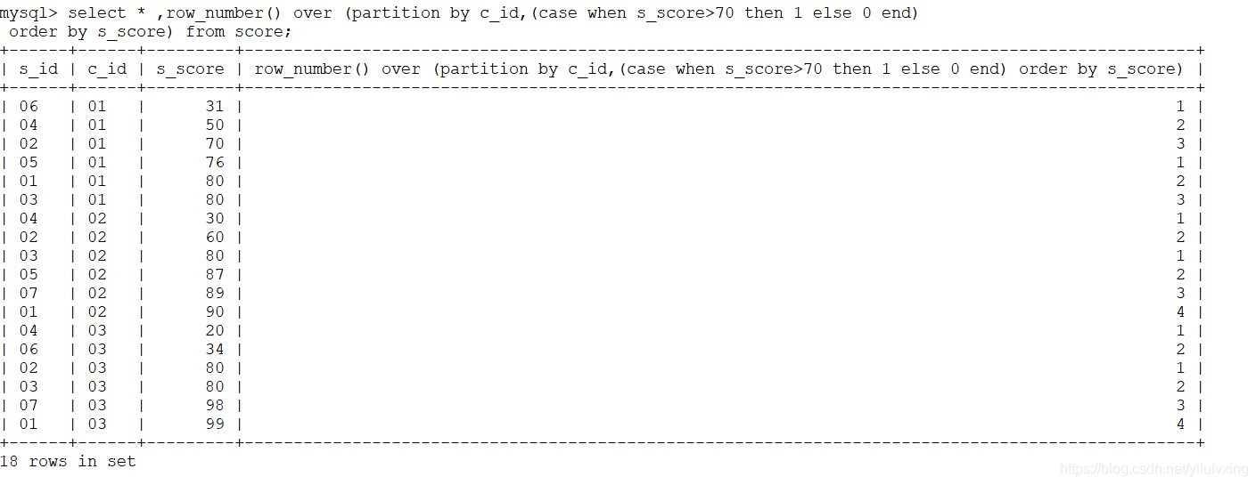 select * ,row_number() over (partition by c_id,(case when s_score>70 then 1 else 0 end) order by s_score) from score;