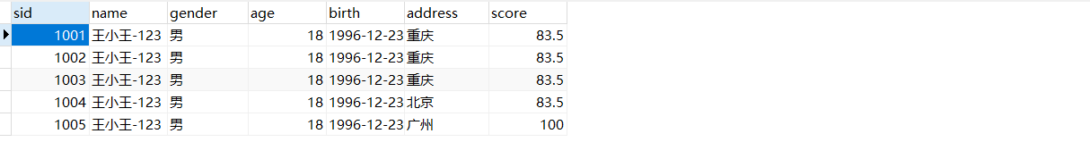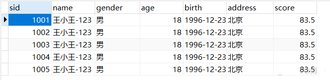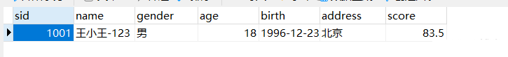insert into student(sid,name,gender,age,birth,address,score) values(1001,'王小王-123','男',18,'1996-12-23','北京',83.5);