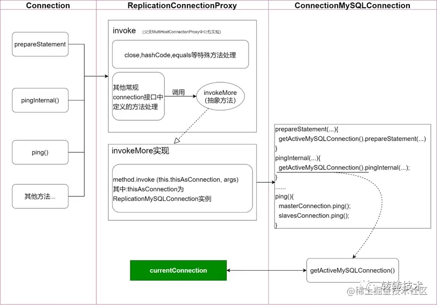 對(duì)于業(yè)務(wù)邏輯而言,獲取到的Connection實(shí)例,是ReplicationConnection代理對(duì)象,該代理對(duì)象通過ReplicationConnectionProxy和ReplicationMySQLConnection相互協(xié)同完成對(duì)數(shù)據(jù)庫(kù)訪問的處理,其中ReplicationConnectionProxy在實(shí)現(xiàn) InvocationHandler的同時(shí),還充當(dāng)對(duì)連接管理的角色,核心邏輯如下圖: