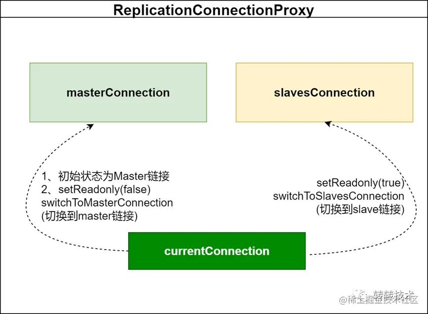 ReplicationConnectionProxy存在masterConnection和slavesConnection兩個(gè)實(shí)際連接對(duì)象,currentConnetion(當(dāng)前連接)可以切換成mastetConnection或者slavesConnection,切換方式可以通過設(shè)置readOnly實(shí)現(xiàn)。