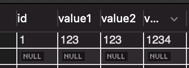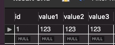 value3 = '1234';執(zhí)行完,查詢表數(shù)據(jù),顯示如下: