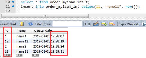 觀察create_date可以看出,插入順序?yàn)? , 12 , 2, 11。 查詢結(jié)果也是1 , 12 , 2,11, 因此一定不是按照id排序的。 強(qiáng)調(diào):當(dāng)前表的id類型為int