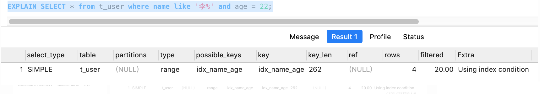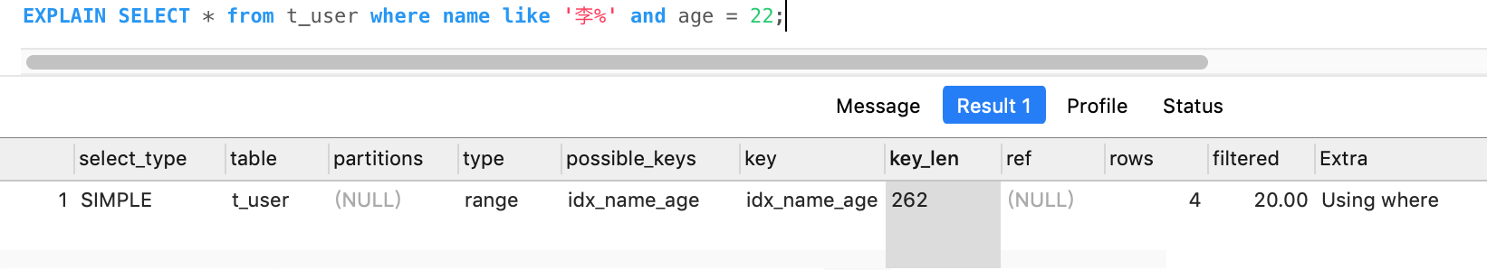 EXPLAIN SELECT * from t_user where name like '李%' and age = 22;