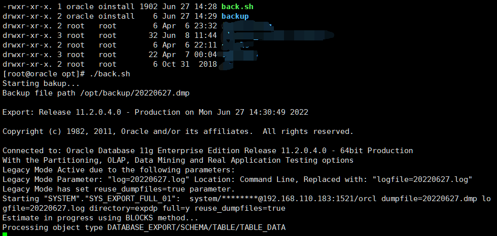 [root@]$ expdp dbuser/passwd@192.168.110.9:1521/orcl dumpfile=dbback.dmp log=log.log directory=back_dir schemas=cbyxy