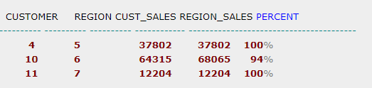 100 * round(cust_sales / region_sales, 2) || '%' Percent from