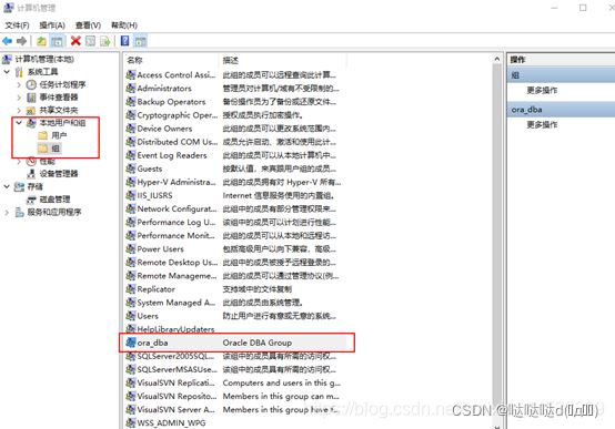 接下來打開【計算機管理】,選擇【本地用戶和組】,展開【組】,找到“ora_dba”