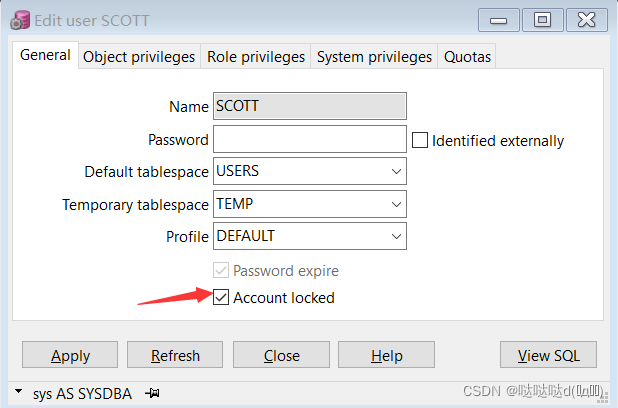 System賬戶已經(jīng)知道密碼了,我們可以通過sys賬戶登錄,解鎖普通用戶。