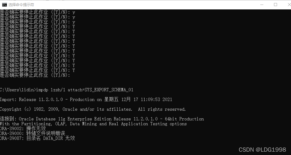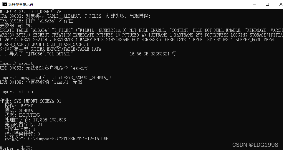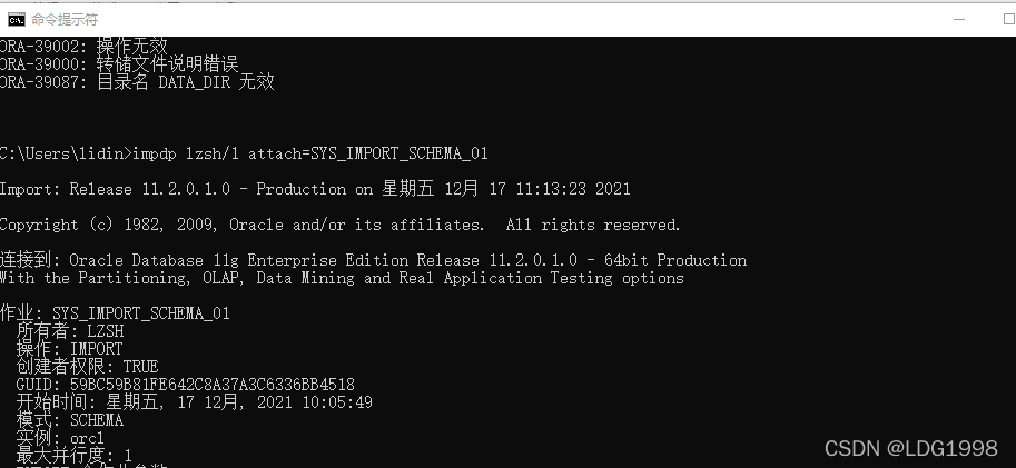 impdp 剛剛作業(yè)導入的用戶名/密碼 attach=SYS_EXPORT_SCHEMA_01