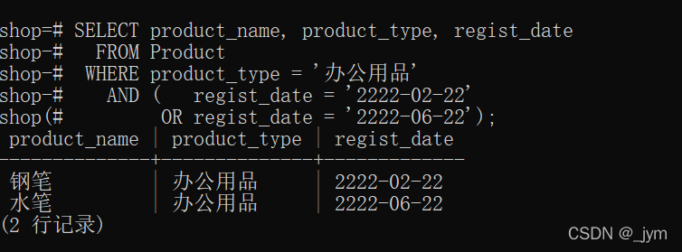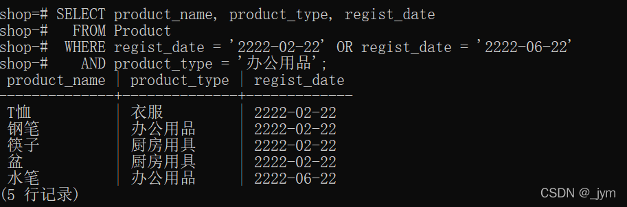 AND運(yùn)算符的優(yōu)先級(jí)高于OR運(yùn)算符,如果想要選出product_type = ‘辦公用品’,而且登記日期為2222-02-22或2222-06-22,按照下面這個(gè)方式是不行的。