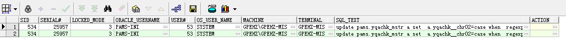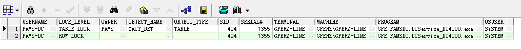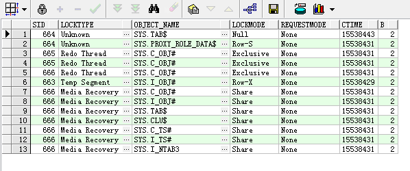 列:ADDR:鎖定狀態(tài)對象地址;KADDR:鎖地址;SID :會話id;ID1:鎖標(biāo)識符#1;ID2:鎖標(biāo)識符#2;LMODE:會話持有的鎖模式(0~6);REQUEST:進程請求的鎖模式(0~6);