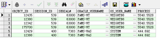 SELECT l.session_id sid, s.serial#, l.locked_mode, l.oracle_username, l.os_user_name, s.machine, s.terminal, o.object_name, s.logon_time FROM v$locked_object l, all_objects o, v$session s WHERE l.object_id = o.object_id AND l.session_id = s.sid ORDER BY sid, s.serial#;