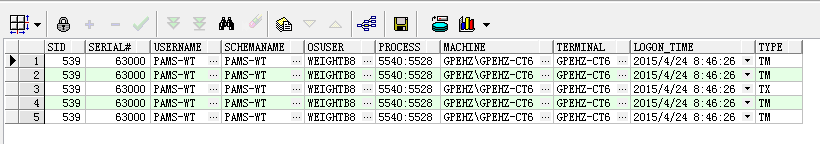 SELECT s.sid, s.serial#, s.username, s.schemaname, s.osuser, s.process, s.machine, s.terminal, s.logon_time, l.TYPE FROM v$session s, v$lock l WHERE s.sid = l.sid AND s.username IS NOT NULL ORDER BY sid;