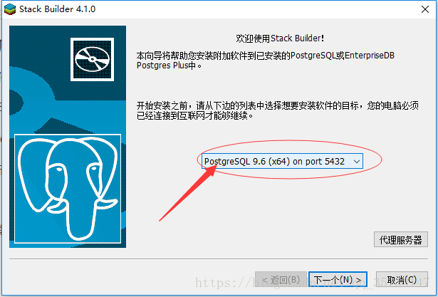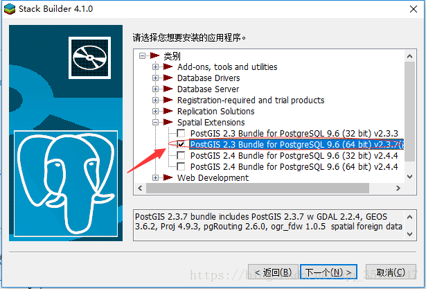 Stack Builder運行后,選擇安裝目標(biāo)軟件為PostgreSQL 9.6 on port 5432。然后在安裝程序選擇對話框中選擇PostGIS 2.3。