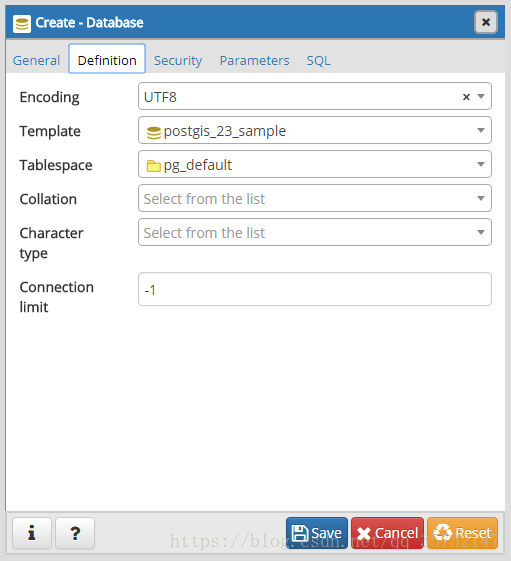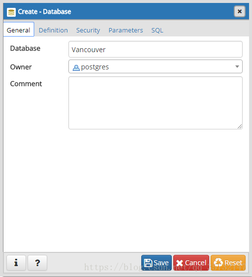選中數(shù)據(jù)庫服務(wù)器內(nèi)容中的數(shù)據(jù)庫,然后選擇其右鍵菜單中的”新建數(shù)據(jù)庫“命令,打開”新建數(shù)據(jù)庫“對話框。首先在”屬性“面板中設(shè)置數(shù)據(jù)庫名稱,因為本書將使用加拿大溫哥華市的數(shù)據(jù),因此將數(shù)據(jù)庫名稱設(shè)置為"Vancouver";并將所有者設(shè)置為”postgres"。然后切換到“定義”面板中,將模板設(shè)置為"postgis_21_sample"。設(shè)置如下圖所示: