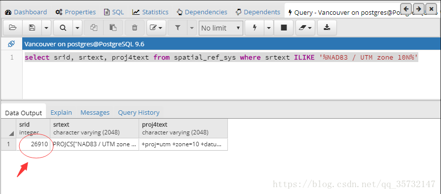 查詢結(jié)果如下圖所示,得知該空間數(shù)據(jù)的SRID為26910。