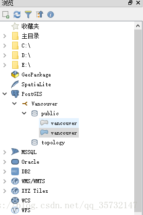 建立連接以后,便可以在“瀏覽器”中列出數(shù)據(jù)庫服務(wù)器中所有的空間圖層,如下圖所示,選中某圖層,將其拖入圖層控制器中便可在地圖中打開該空間數(shù)據(jù)。