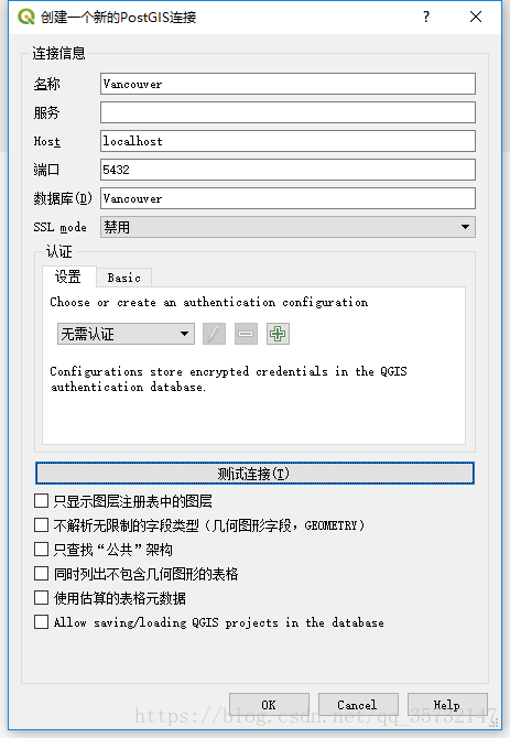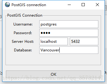首先單擊"View connection details"按鈕,打開"PostGIS connection"對話框,輸入用戶名"postgres"及其對應(yīng)的密碼,設(shè)置連接的數(shù)據(jù)庫為Vancouver,如下圖所示: