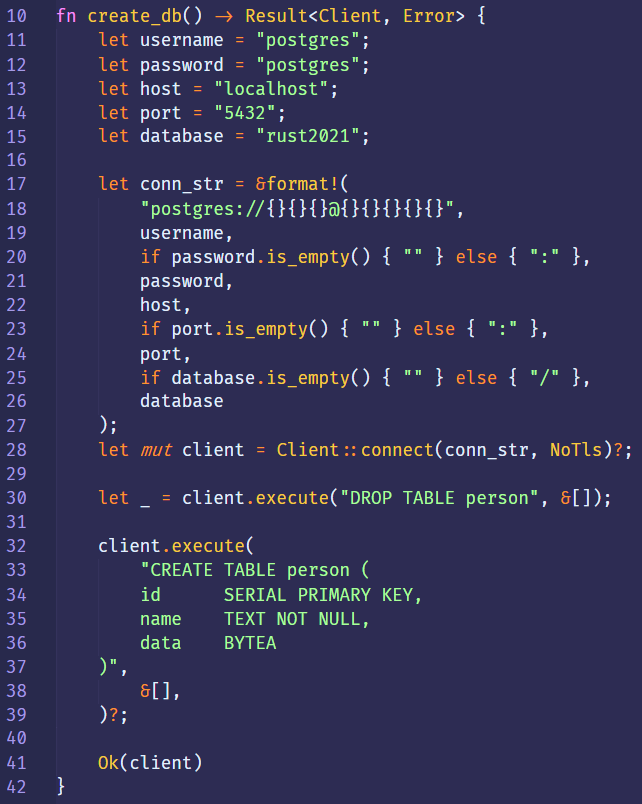 let mut client = Client::connect(conn_str, NoTls)?;