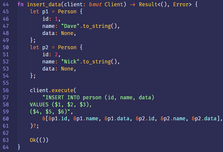 fn insert_data(client: &mut Client) -> Result<(), Error> {