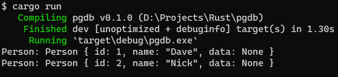 println!("Person: {:?}", p);到此這篇關(guān)于Rust連接PostgreSQL數(shù)據(jù)庫(kù)的文章就介紹到這了,更多相關(guān)RustPostgreSQL數(shù)據(jù)庫(kù)內(nèi)容請(qǐng)搜索本站以前的文章或繼續(xù)瀏覽下面的相關(guān)文章希望大家以后多多支持本站!